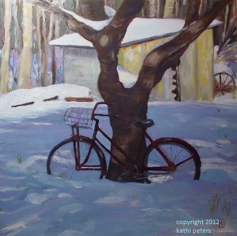 I have done a new oil painting, again with a copper panel for the substrate.The subject of the painting is an old bicycle that stands leaning on an old tree....and has been standing there for several years now....summer, winter,spring and fall...in all weather....in snow or rain. I have been wanting to, planning on painting it, for a long time. Each time I drove by the yard where the bike sits, I would say to myself...."Paint that!" It was time to do it last week....so here it is. I have added it to my website.